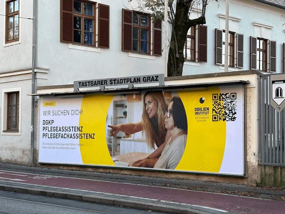 Wir suchen Verstärkung für unser Seniorenwohnhaus! Dazu nutzen wir alle Möglichkeiten, jetzt auch das riesige, 4 Meter lange Plakat entlang der Leonhardstraße, direkt an der viel frequentierten Straßenbahnlinie 7. Wenn Du es noch nicht erspäht hast, dann kannst Du es hier ansehen!